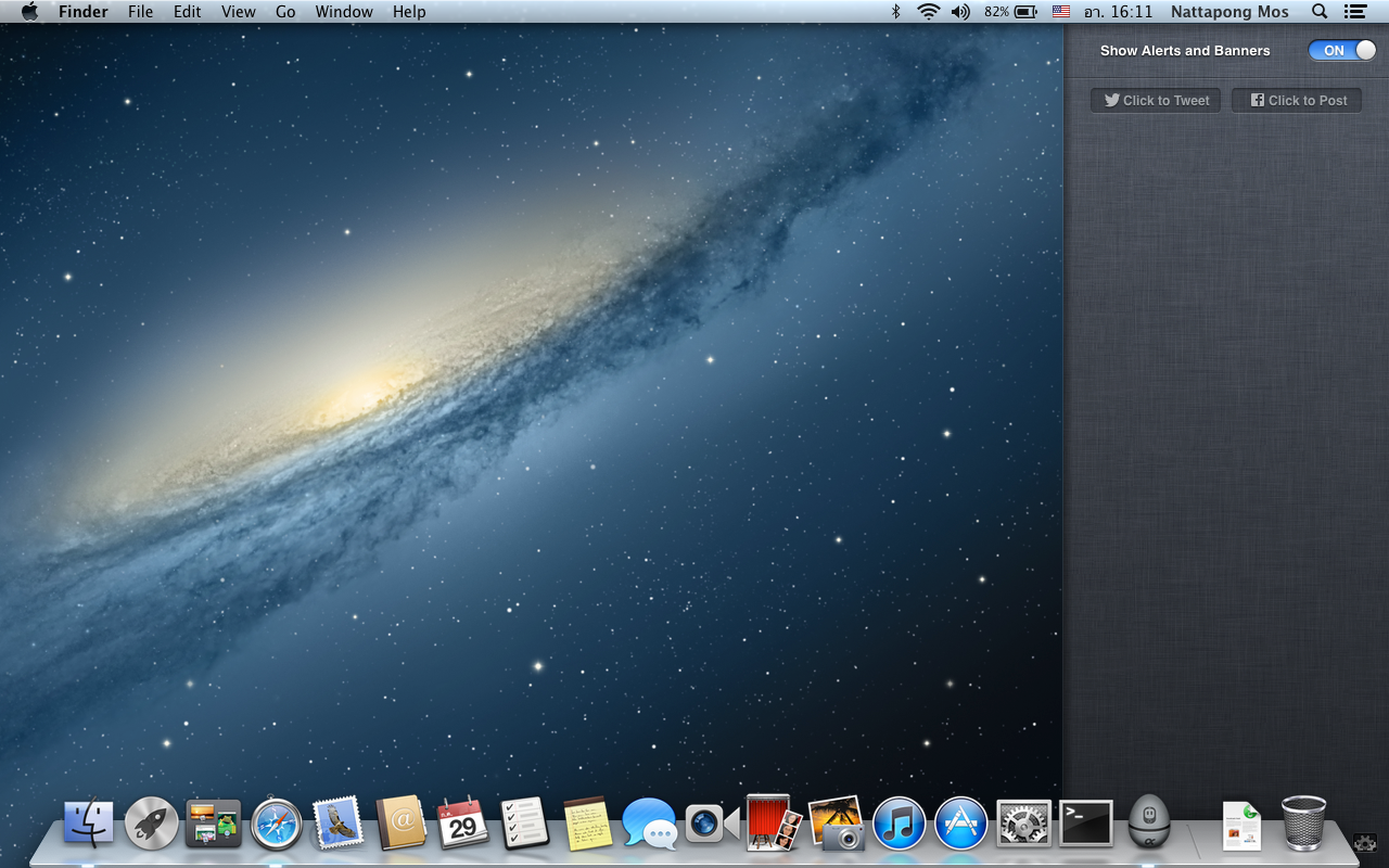 Notification Center เรียกได้จากปุ่มบนสุดขวาสุด แต่ในเมื่อเรามี Multi-touch Trackpad ก็ต้องใช้ให้เป็นประโยชน์สิครับ โดยการใช้สองนิ้ววางไว้ข้างขวาของ Trackpad และถูกลับมาทางซ้าย ถ้านึกไม่ออกลองไปดูวีดีโอสาธิตที่ System Preferences -> Trackpad เลือกหัวข้อ Multi-touch Gestures ในนั้นจะมีวีดีโอสาธิตให้ดูครับ