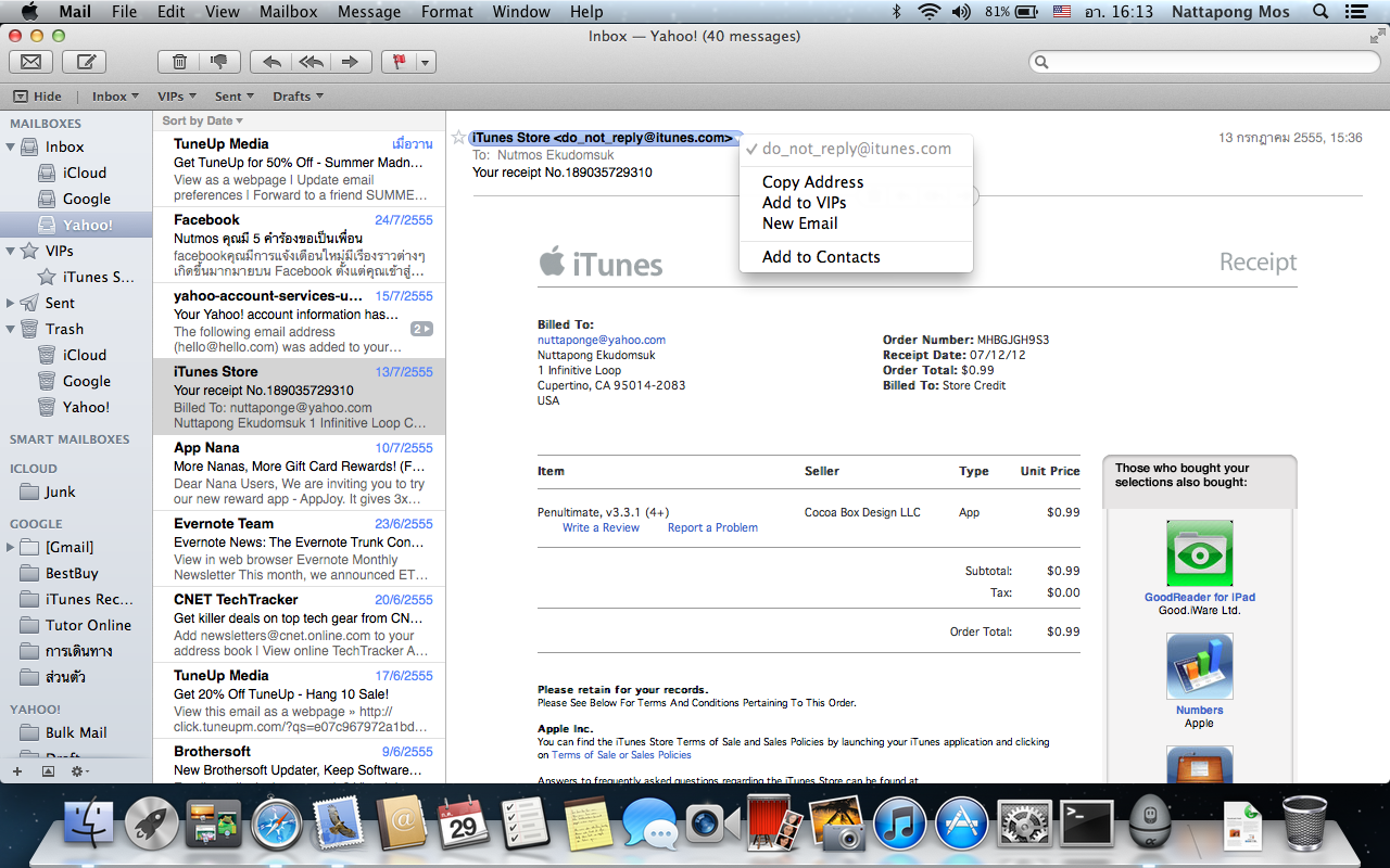 VIP Mailbox เป็นกล่องเมลล์ไว้สำหรับอีเมลล์จากบุคคลสำคัญ วิธีเพิ่ม Account Mail ไปยัง VIP Mail ทำได้โดยเลื่อนเม้าส์ไปยังชื่อ และกดลูกศรด้านขวา จะมีตัวเลือกให้เราเก็บไว้ยัง VIP Mailbox