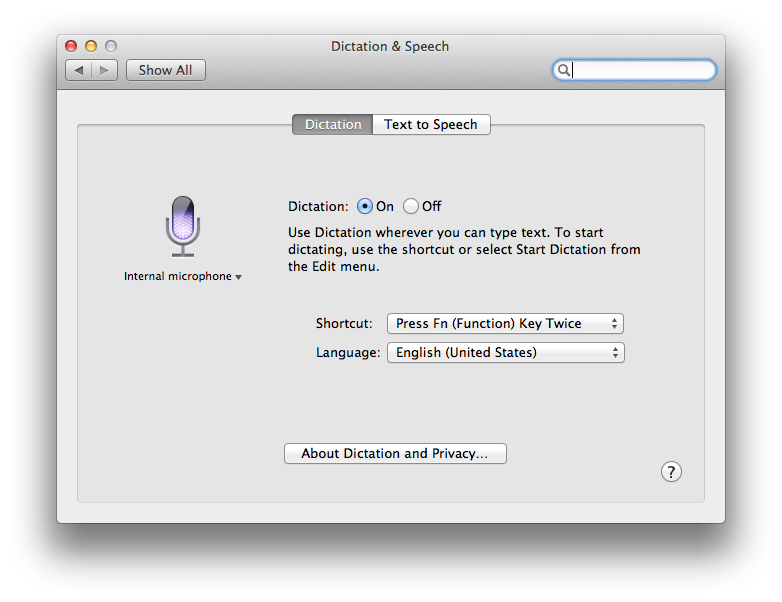 Dictation ไม่ได้ถูกเปิดเป็นค่าเริ่มต้นใน Mountain Lion ต้องไปเปิดที่ System Prefernences -> Dictation & Speech