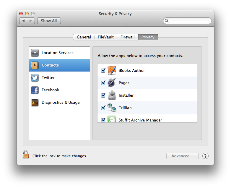 ไม่ว่าโปรแกรมจะต้องการใช้ Contacts, Twitter, Location Services ก็จะต้องถามผู้ใช้ก่อน และสามารถไปตั้งค่าด้วยตนเองได้ที่ System Preferences -> Security & Privacy เลือกแถบ Privacy