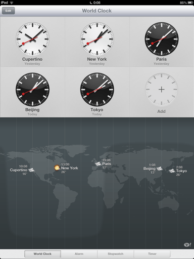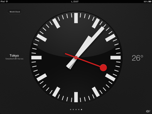 นับว่าเป็นครั้งแรกที่ iPad ใส่นาฬิกาเข้ามาให้ (เสียที) หลังจากเมื่อก่อน ถ้าจะตั้งนาฬิกาปลุกใน iPad ต้องหาแอพมาช่วย แต่แน่นอนว่า เมื่อ iPad ใส่นาฬิกาเข้ามาให้ก็ต้องไฉไลหน่อย เป็นอย่างไร ไปดู