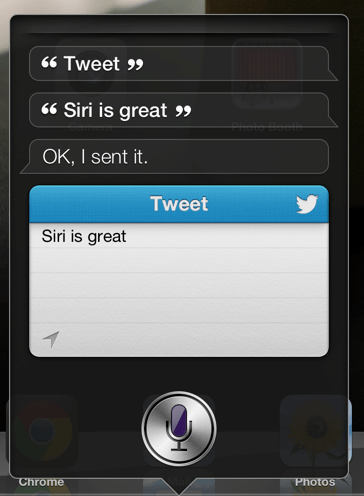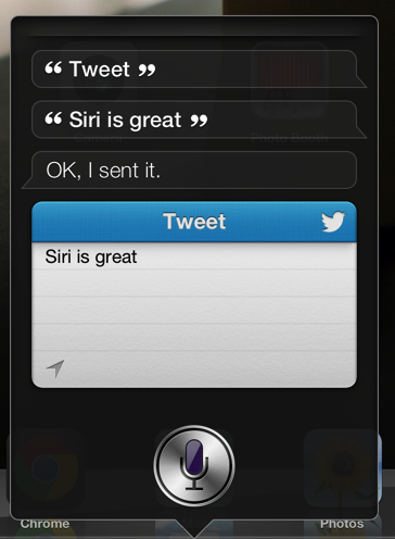 Siri ทำอะไรได้บ้าง แน่นอน คำถามร้านกีฬา ร้านอาหาร หรือภาพยนตร์นั้น ใช้ในไทยไม่ได้แน่นอน T T แต่สิ่งที่ได้แน่ ๆ คือ อัพเดท Status บน Facebook, Twitter พร้อมทั้ง Share Location ได้ ทีนี้แม้อยู่บนรถ ก็สามารถบอกทุกคนได้ว่าคุณอยู่ที่ไหน