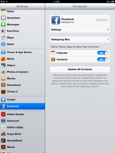 หลังจากการรวม Twitter เกิดขึ้นบน iOS แล้ว ไหนเลยจะไม่มี Facebook ตามมาด้วย (แต่ Android มีมานานแล้ว เนื่องจากเป็นระบบเปิด) ดังนั้น Apple จัดให้ ใส่ Facebook ทุกมุม มาให้คุณ ๆ ได้อัพ Status, ภาพ ฯลฯ ได้อย่างง่ายดาย