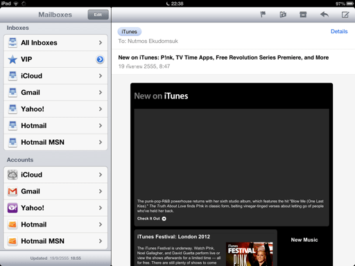 และอีกฟีเจอร์ ลองสังเกตว่า ปกติมุมซ้ายล่างของ Mail จะเป็นปุ่ม Refresh ซึ่งมันหายไปแล้ว แน่นอน Mail ใช้ระบบ Pull to refresh เหมือน Twitter, Facebook ฯลฯ แล้ว