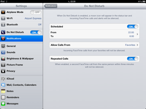 งดส่งเสียงรบกวน เป็นฟีเจอร์ที่ควรจะมีใน iOS มานาน (มาก ๆ) แล้ว ซึ่งแน่นอนว่าตอนออก iOS 5 นั้น Apple มั่นใจในระบบ Notifications ของตนเองจนลืม (หรือตั้งใจ) ไม่ใส่ปุ่มปิดทั้งหมดมาให้ (สังเกต ใน iOS ก่อน ๆ Apple จะใส่ปุ่มปิด Notifications มาให้) แต่วันนี้ มันกลับมาอีกครั้งใน iOS 6 ในชื่อว่า Do Not Disturb เป็นการปิดเสียงเครื่องทั้งหมด ยกเว้นโทรศัพท์จาก List บุคคลที่เราเลือกขึ้นมาว่าอนุญาตให้ดังในโหมดนี้ได้ นอกนั้น เสียงทุกอย่างจะถูกปิดหมด และสามารถตั้งเวลา Do Not Disturb ได้