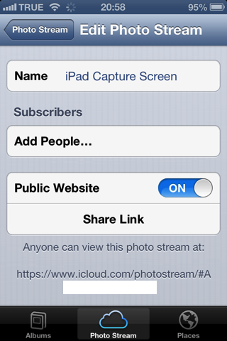เมนูจัดการการแชร์ภาพผ่าน Photo Stream โดยให้เลือกว่าจะแชร์ให้ใคร ชื่ออัลบั้ม และเลือกว่าจะเผยแพร่สู่สาธารณหรือไม่