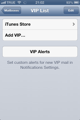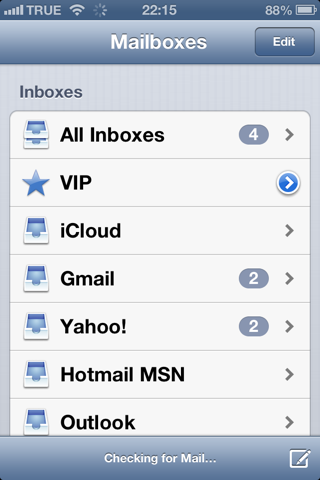 จะมี VIP Mail ขึ้นมา ลองสังเกตดูว่า icon refresh หายไป ซึ่ง Mail บน iOS 6 จะใช้การ Pull to Refresh แทน (เหมือนแอพ Twitter)