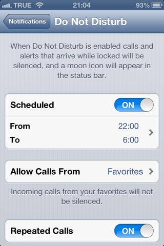ซึ่ง Do Not Disturb จะตัดการเตือน Notifications ทุกอย่าง และโทรศัพท์จะไม่ดัง เพื่อไม่ให้ใครมากวนใจเราตอนนอนหรือตอนที่เราไม่อยากให้ใครกวน ซึ่ง Allow Calls From สามารถปรับเปลี่ยนได้ โดยจะให้อนญาตให้คนที่อยู่ใน Contact List ใดโทรมาได้ในเวลาที่ไม่ต้องการให้ใครกวนใจ หรือจะไม่บล็อคการโทรจากใครเลยก็ได้