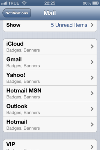 Mail สามารถตั้งค่าใน Settings ->; Notifications ได้ละเอียดกว่าเดิม สามารถแยก Account ได้แล้ว และ VIP Mail ก็แยกต่างหาก