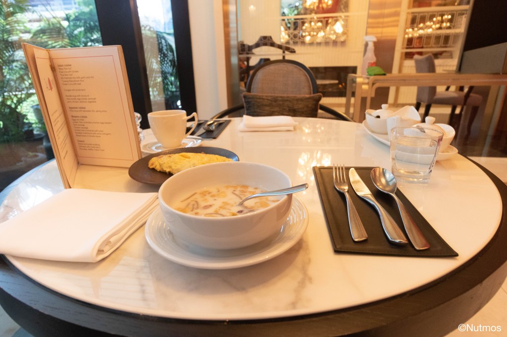 สำหรับอาหารเช้าของโรงแรม The Athenee ในวันที่ผมเข้าพักจะเสิร์ฟที่ห้องอาหาร The Allium Bangkok ที่ชั้น 3 ของโรงแรม โดยตอนเช้าเดินลงมาที่ห้องอาหาร พนักงานจะวัดอุณหภูมิและถามเลขห้อง จากนั้นจะพาไปนั่งโต๊ะและถามว่าจะรับชาหรือกาแฟ ซึ่งเราสามารถเลือกได้ว่าเอาชาหรือกาแฟแบบไหนด้วย