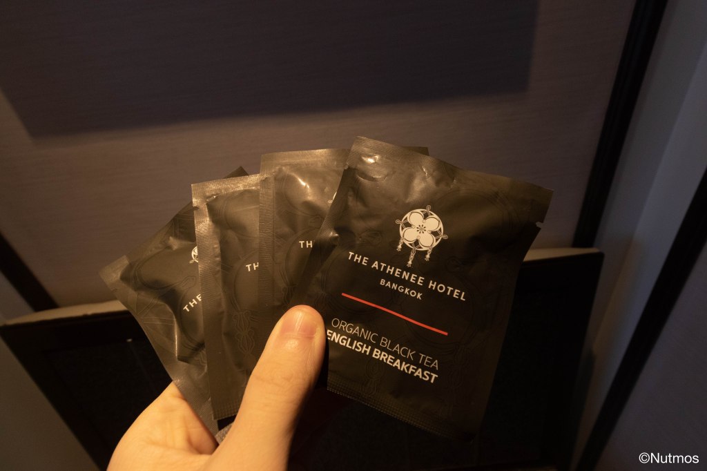 สำหรับ complementary ที่ใช้ในโรงแรม The Athenee จะไม่ได้เป็นของที่พิเศษกว่าโรงแรมอื่นมากนัก (เพราะสิ่งที่โรงแรมทั่วไปเตรียมให้ก็คือพอแล้ว) แต่ความโดดเด่นคือของแทบทุกชิ้นถูกคัดสรรมาค่อนข้างดี ไม่ว่าจะเป็นเครื่องอาบน้ำยี่ห้อ THANN, แปรงสีฟันที่ขนกำลังดี, กาแฟแคปซูลพร้อมเครื่องชง illy, ชาเป็นซองพร้อมกาต้มน้ำ และอื่น ๆ อีกมากมาย ที่หลาย ๆ อย่างอาจจะดูเป็นสิ่งพื้นฐาน แต่จากการคัดสรรก็ทำให้รู้สึกได้ว่า แม้จะเป็นสิ่งพื้นฐาน แต่คุณภาพไม่เหมือนที่อื่น