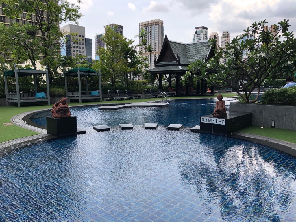 สระว่ายน้ำของ The Athenee เป็นสระแบบ Lagoon ที่ออกแบบมาเหมาะกับการพักผ่อน มีเก้าอี้ตั้งไว้ที่เมื่อว่ายน้ำเสร็จก็สามารถนอนรับลมเย็น ๆ พร้อมกับบาร์ที่สามารถสั่งอาหารและเครื่องดื่มได้