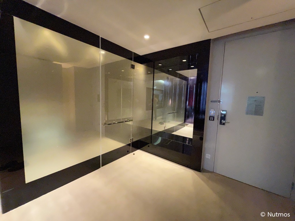 ส่วนโซนห้องน้ำกับห้องนอนจะอยู่เข้ามาอีกขั้น ตรงนี้จะออกแบบโดยไม่มีประตู ต้องใช้ผ้าม่านกั้นระหว่างห้องน้ำกับห้องนอน ซึ่งเอาเข้าจริงแล้วผมไม่ค่อยชอบการออกแบบลักษณะนี้ แต่เข้าใจได้ว่าธีมของโรงแรมคือต้องการนำเสนอโรงแรมแบบคู่รัก ผมจึงไม่ได้คิดว่าอันนี้เป็นจุดบกพร่องนะ