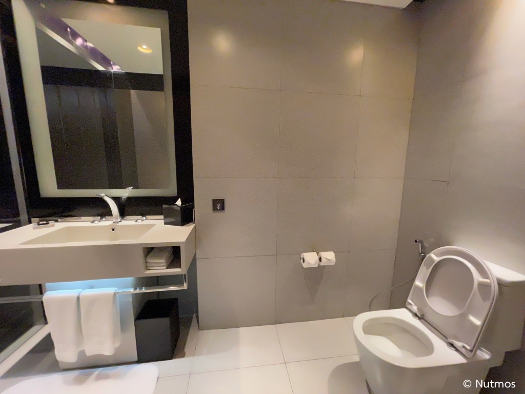 ห้องน้ำรอบนี้จะออกแบบต่างกับ Studio Suite คือกรณีของ Studio Suite จะออกแนวยาว ในขณะที่ Marvelous Suite จะเป็นสี่เลี่ยม ตัวอ่างอาบน้ำมีทีวีให้ (แต่คิดว่ามือถือกันน้ำจำเป็นกว่านะ ฮา) ต่างจากตัว Studio Suite ที่อ่างอาบน้ำจะเห็นวิวเมือง ซึ่งส่วนตัวผมแล้วผมชอบอ่างอาบน้ำของ Studio Suite มากกว่า