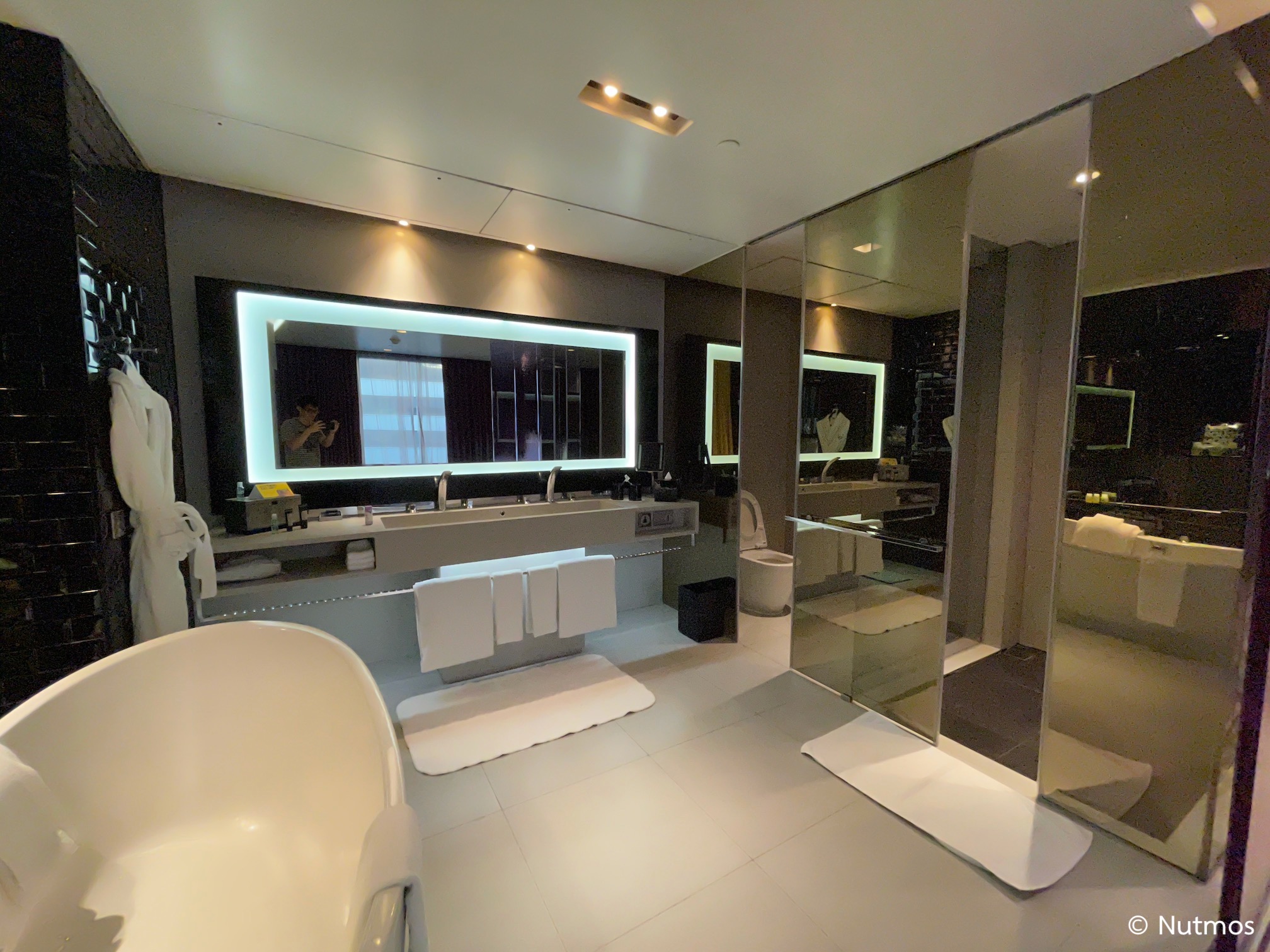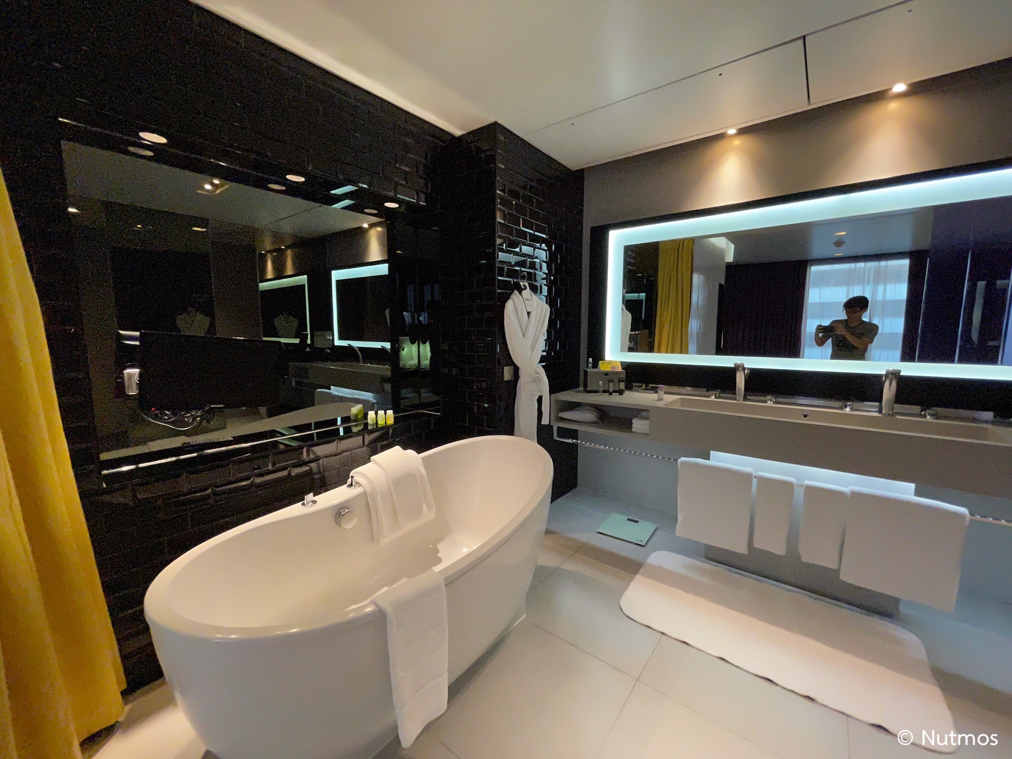 ห้องน้ำรอบนี้จะออกแบบต่างกับ Studio Suite คือกรณีของ Studio Suite จะออกแนวยาว ในขณะที่ Marvelous Suite จะเป็นสี่เลี่ยม ตัวอ่างอาบน้ำมีทีวีให้ (แต่คิดว่ามือถือกันน้ำจำเป็นกว่านะ ฮา) ต่างจากตัว Studio Suite ที่อ่างอาบน้ำจะเห็นวิวเมือง ซึ่งส่วนตัวผมแล้วผมชอบอ่างอาบน้ำของ Studio Suite มากกว่า