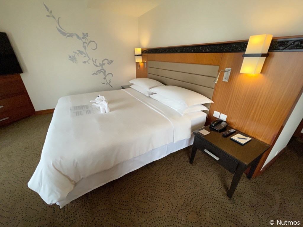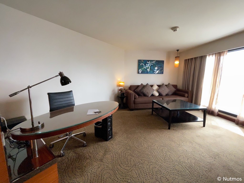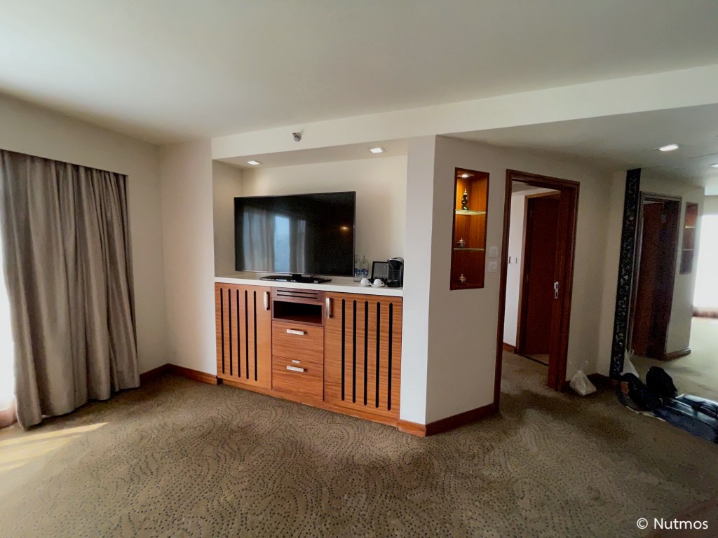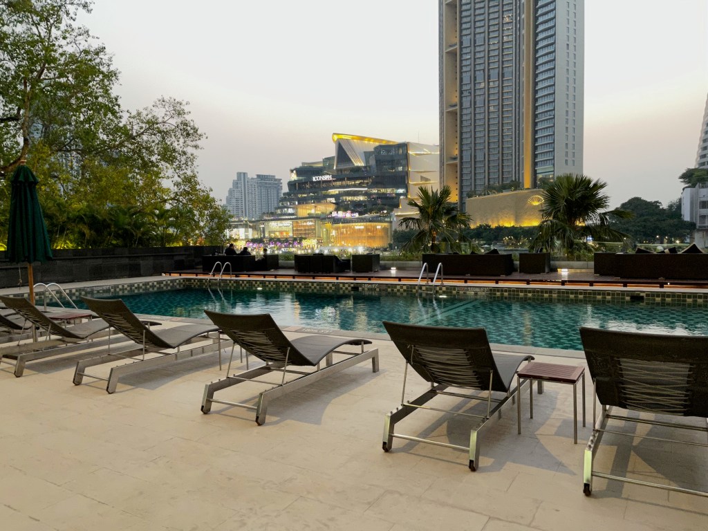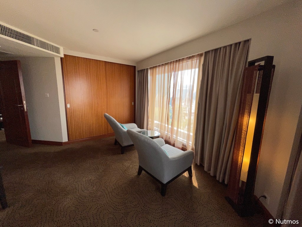 ห้องพักที่ผมได้เป็นห้อง Executive Room อยู่ชั้น 9 ที่จะอยู่ตรงมุมตึกพอดี เป็นมุมใกล้แม่น้ำที่สุด และในห้องมีหน้าต่างบานใหญ่ 3 บาน ทำให้ตอนกลางวันแทบไม่ต้องเปิดไฟห้องก็สว่าง ตัวห้องเป็นมุมไอคอนสยาม ทำให้ห้องนี้ค่อนข้างออกจะวิวดีพอสมควร มีห้องนั่งเล่นแยกออกจากห้องนอนเป็นสัดส่วนชัดเจน แต่ข้อเสียที่เห็นคือระบบแสงสว่างไม่ดี ไฟค่อนข้างน้อย เปิดไฟสุดในห้องตอนกลางคืนยังมืด ๆ สลัว ๆ อยู่