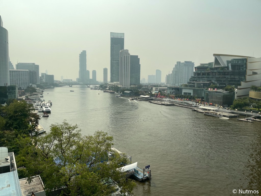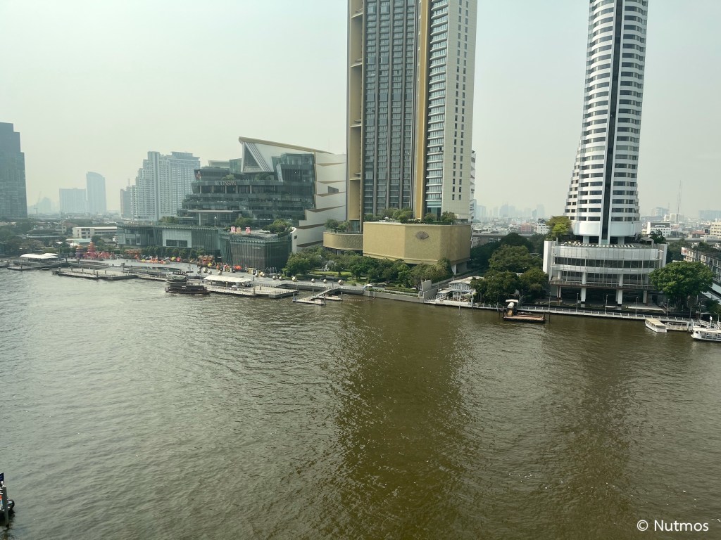 วิวเมื่อมองออกนอกหน้าต่างห้องนั่งเล่นเป็นโค้งน้ำเจ้าพระยา เห็นไอคอนสยาม, โรงแรม The Peninsula, Mandarin Oriental, Shangri-la และอื่น ๆ