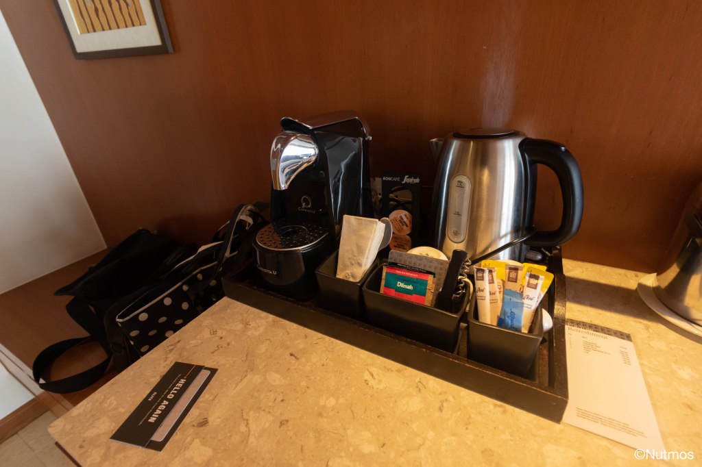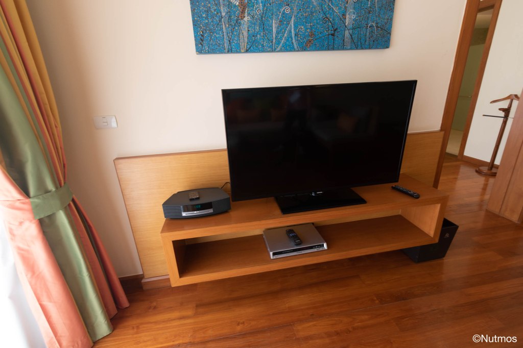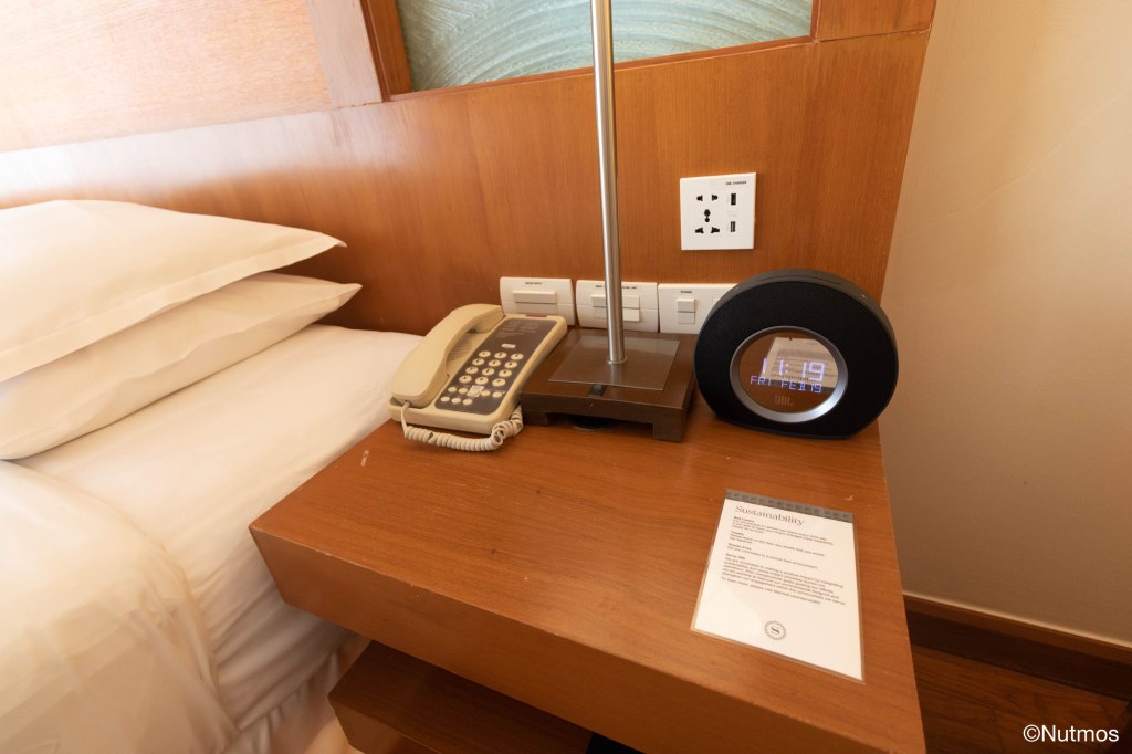 ห้องนอนที่นี่ขนาดใหญ่มาก มีทีวีให้ มีเก้าอี้ มีโทรศัพท์ พร้อมที่ชาร์จแบตแบบ USB ติดตั้งไว้เรียบร้อย ส่วนลำโพงที่นี่ใช้ของ JBL Horizon (ที่ผมเรียกว่าเป็นลำโพงสหกรณ์ Marriott)