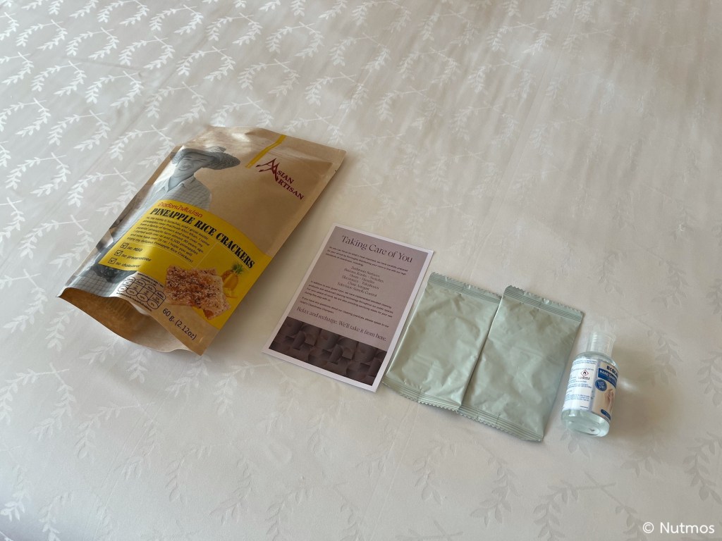 ของต้อนรับที่นี่มีขนม พร้อมกับผ้าเช็ดมือกับเจลล้างมือเป็นของเสริมช่วง COVID-19